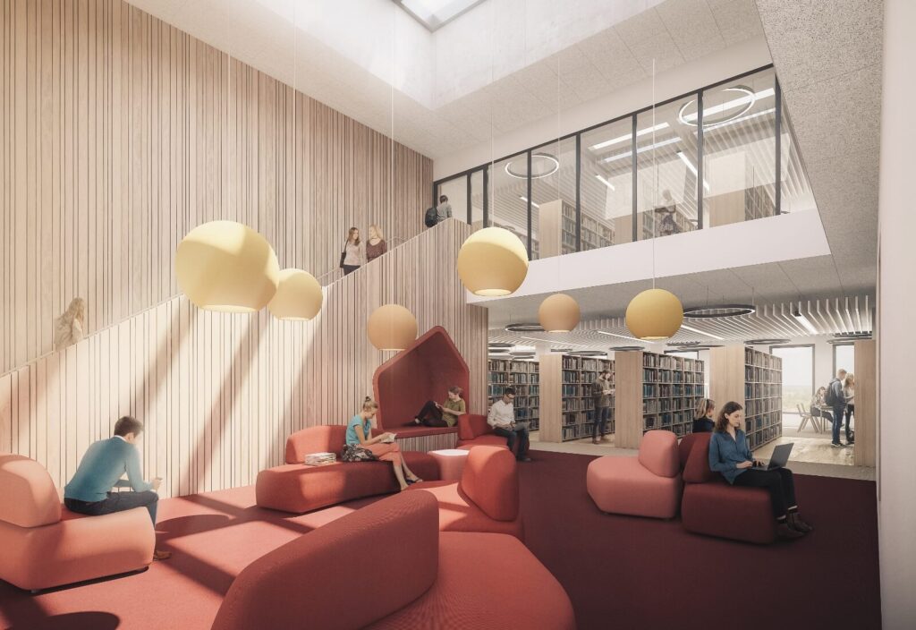 The centerpiece of the campus will be an extensive park-like greenspace, which will connect both sections. Walkways and seating options will offer an inviting atmosphere for study and relaxation, enhancing campus life.